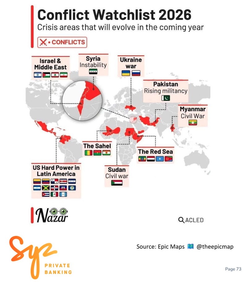 El gráfico de Conflict Watchlist 2026 que mostramos a continuación sintetiza en una sola imagen algo que ya resulta evidente para cualquiera que observe con atención el panorama global: la estabilidad geopolítica ya no puede darse por sentada. Confluyen tensiones en Oriente Medio, el Mar Rojo, Ucrania, el Sahel o Myanmar, pero también, como se ha puesto de manifiesto a comienzos de este año con la intervención en Venezuela, un aumento significativo de la actividad estadounidense en América Latina. Este último punto no puede separarse del nuevo enfoque estratégico de la administración Trump en materia de seguridad nacional, orientado a reforzar el liderazgo estadounidense en su “hemisferio natural” de influencia y a otorgar un papel central a los recursos naturales críticos.